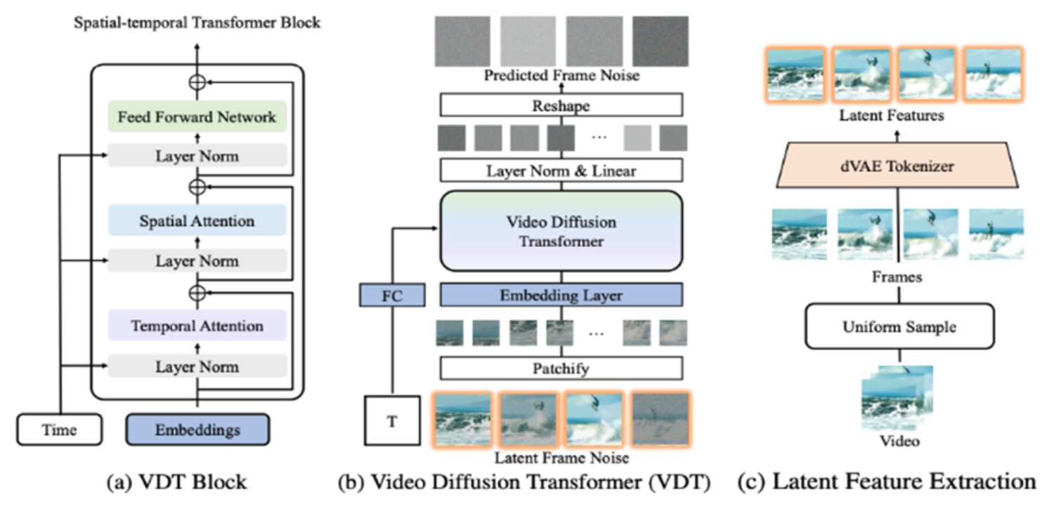 Token Concatenation: Since the VDT model adopts pure transformer architectures, using conditional frames directly as input tokens is a more intuitive approach. Researchers achieve this by concatenating conditional frames (latent features) and noisy frames at the token level, which are then fed into VDT. Subsequently, they split the output frame sequence of VDT and used the predicted frames for the diffusion process, as shown in Figure 3 (b). Researchers find that this approach demonstrates the fastest convergence speed and provides better performance in the final results compared to the first two methods. Moreover, researchers find that even when using fixed-length conditional frames during training, VDT can still accept conditional frames of arbitrary lengths as input and output consistent predicted features.