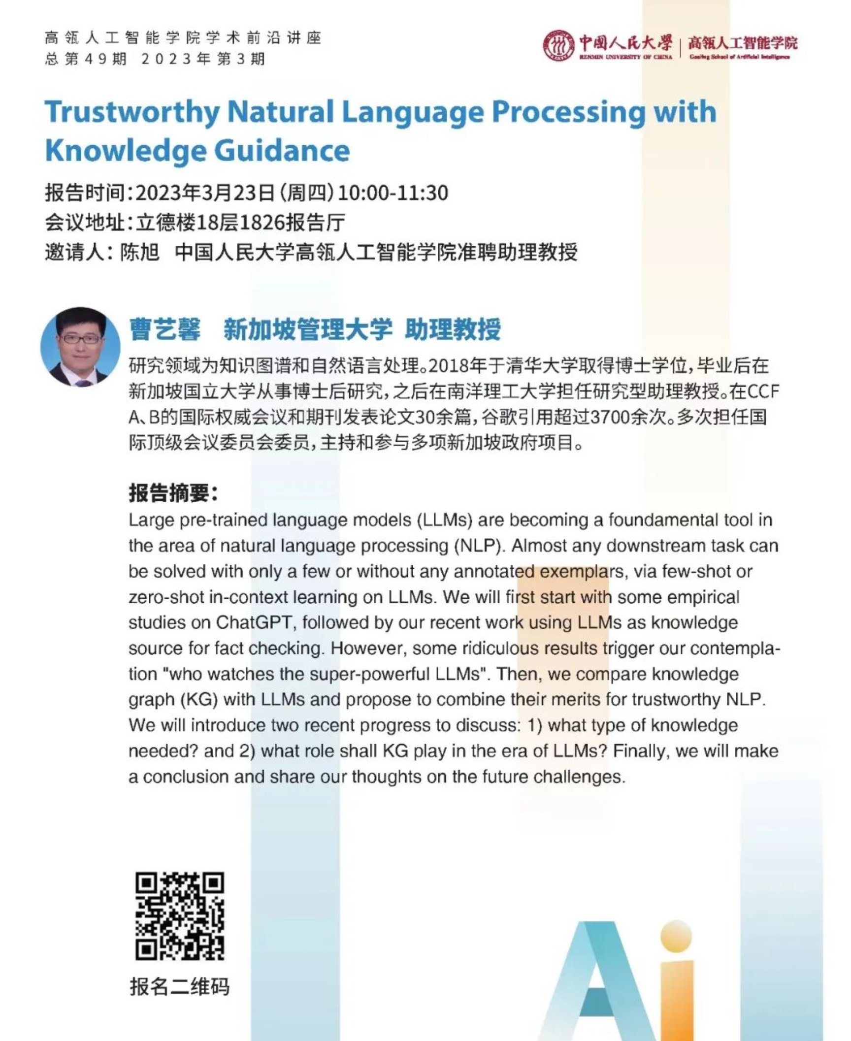 报告摘要:Large pre-trained language models (LLMs) are becoming a foundamental tool in the area of natural language processing (NLP). Almost any downstream task can be solved with only a few or without any annotated exemplars, via few-shot or zero-shot in-context learning on LLMs. We will first start with some empirical studies on ChatGPT, followed by our recent work using LLMs as knowledge source for fact checking. However, some ridiculous results trigger our contemplation "who watches the super-powerful LLMs". Then, we compare knowledge graph (KG) with LLMs and propose to combine their merits for trustworthy NLP. We will introduce two recent progress to discuss: 1) what type of knowledge needed? and 2) what role shall KG play in the era of LLMs? Finally, we will make a conclusion and share our thoughts on the future challenges.