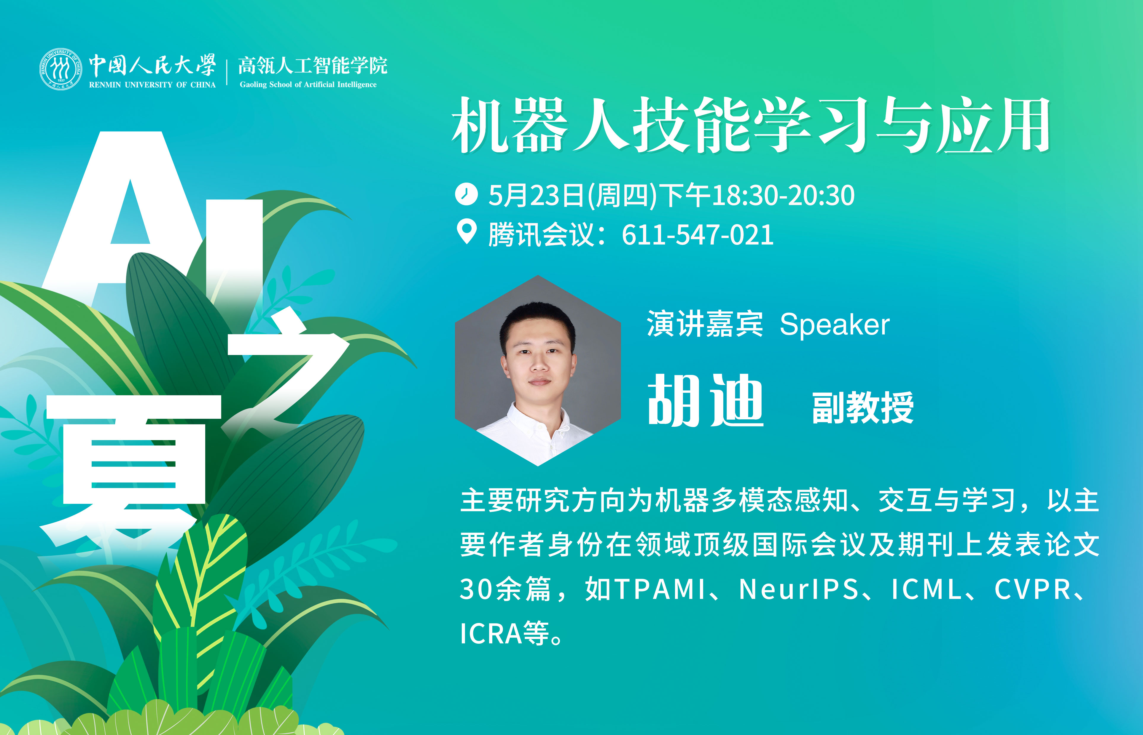 讲者简介:胡迪,现任18JAV 准聘副教授,博导,受中国科协青年人才托举工程资助。主要研究方向为机器多模态感知、交互与学习,以主要作者身份在领域顶级国际会议及期刊上发表论文30余篇,如TPAMI、NeurIPS、ICML、CVPR、ICRA等。代表性工作如多模态场景理解算法DMC;平衡多模态学习理论,机制与方法;和以运动学为引导的可泛化物体操纵等。