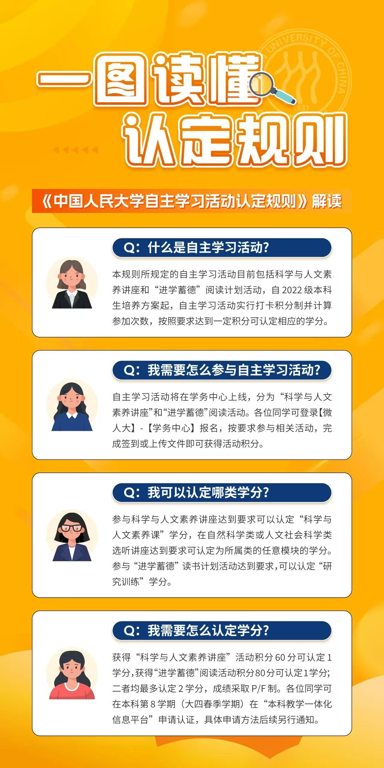 18JAV 通识讲座将均在学务中心上线,各位同学可登录【微人大】-【学务中心】报名(可扫描海报二维码登录),按要求参与即可获得“通识讲座”活动积分。自2022级本科生起,获得“通识讲座”活动积分60分可认定为1学分,最多认定2学分,成绩采取P/F制,具体认定流程见《18JAV 自主学习活动学分认定规则》。