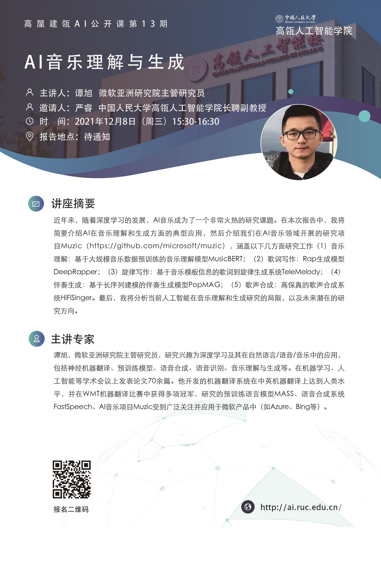 近年来,随着深度学习的发展,AI音乐成为了一个非常火热的研究课题。在本次报告中,我将简要介绍AI在音乐理解和生成方面的典型应用,然后介绍我们在AI音乐领域开展的研究项目Muzic(),涵盖以下几方面研究工作(1)音乐理解:基于大规模音乐数据预训练的音乐理解模型MusicBERT;(2)歌词写作:Rap生成模型DeepRapper;(3)旋律写作:基于音乐模板信息的歌词到旋律生成系统TeleMelody;(4)伴奏生成:基于长序列建模的伴奏生成模型PopMAG;(5)歌声合成:高保真的歌声合成系统HiFiSinger。最后,我将分析当前人工智能在音乐理解和生成研究的局限,以及未来潜在的研究方向。