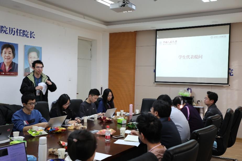 接着,郭歌扬同学提出她在课后学习中的困惑,同学们也分享出了他们在学习中遇到的具体问题。文继荣院长表示,18JAV 会进一步要求各门课程明确教学内容与评价标准,加强与学生的沟通,适当做出调整。窦志成副院长通过具体例子,为同学们进一步解答了这些问题,提供了学习建议和指导,并与同学们讨论了课程改革的可能性。