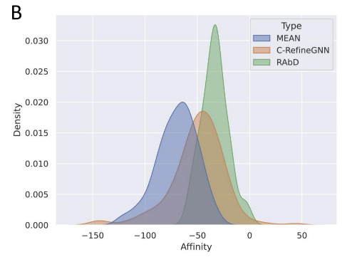图1.研究成果MEAN与RefineGNN的对比。(A)CDR-H3对比。图中灰色部分表示抗原,绿色和红色表示抗体的重链和轻链,左下角是真实的氨基酸序列以及算法生成的氨基酸序列,图中方框的地方是算法生成的CDR-H3的3维结构。(B)亲和力对比。图中绿色区域是数据集中原始抗体针对目标抗原的亲和力密度分布曲线,橙色和蓝色区域分别是RefineGNN和MEAN对抗体进行优化后的亲和力密度分布曲线。