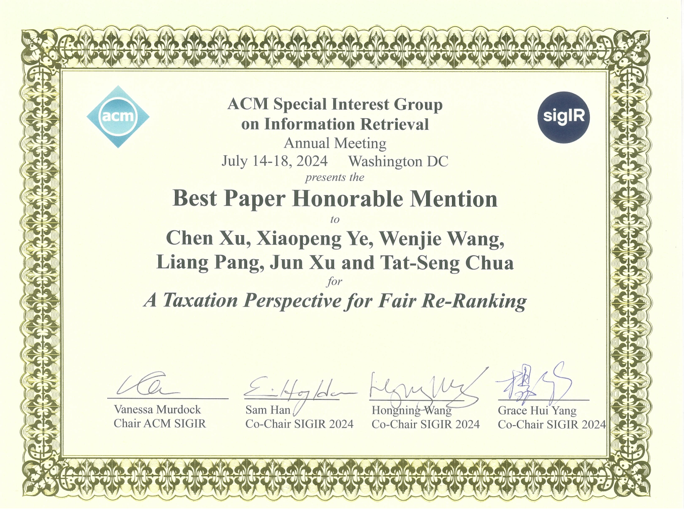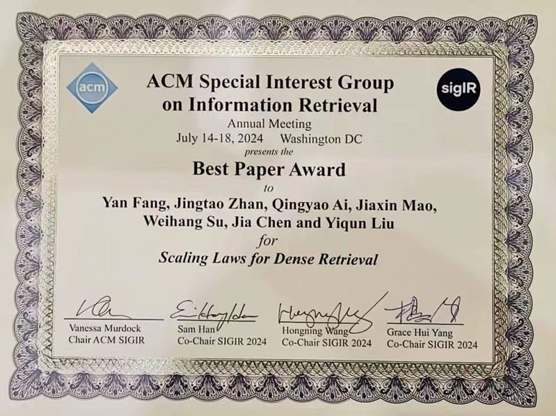 7月17日,信息检索领域国际学术会议SIGIR 2024正式公布了论文获奖名单,18JAV 师生参与的4篇论文获奖。徐君教授团队论文“A Taxation Perspective for Fair Re-ranking”获得了长文最佳论文提名奖(Best Paper Honorable Mention Award), 毛佳昕副教授参与的长文“Scaling Laws for Dense Retrieval”被评为最佳论文奖(Best Paper Award)。徐君教授作为通讯作者的短文“ReCODE: Modeling Repeat Consumption with Neural ODE”,毛佳昕副教授作为通讯作者的演示论文“CoSearchAgent: A Lightweight Collaborative Search Agent with Large Language Models”获得了最佳短文提名(Best Short Paper Nominees)。