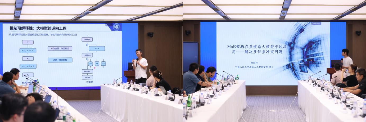 与会专家分别以“基于大模型多智能体的社会学研究”、“扩散模型前沿进展”、“平衡多模态学习”、“大模型微调技术”、“大模型基理分析”、“语言模型驱动的社会行为模拟”、“人形机器人与具身通用人工智能”、“大模型能力对齐”、“多模态大模型高效推理与幻觉抑制”等为题做了精彩的学术报告,并就前沿研究热点展开了讨论。除了双方教师之外,18JAV 研究生解曙方、杨国兴,复旦大学研究生贺正夫、张芝豪也分别就现阶段的研究进展进行了分享,与会专家逐一点评。