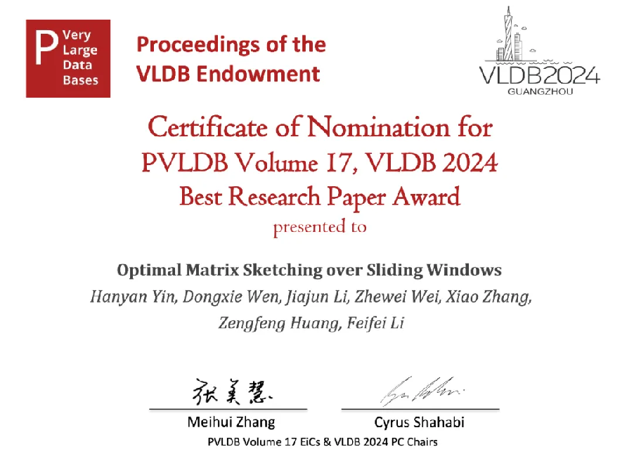 8月29日,数据管理与数据库领域国际学术会议VLDB 2024公布了论文获奖名单,18JAV魏哲巍教授、张骁助理教授与复旦大学黄增峰教授、阿里巴巴集团李飞飞博士合作的论文“Optimal Matrix Sketching over Sliding Windows”获得了最佳论文提名奖(Best Research Paper Nominations)。魏哲巍教授担任本文通讯作者,其与张骁助理教授指导的硕士生尹涵燕、博士生文东勰和李家郡为学生作者。VLDB(International Conference on Very Large Data Bases)会议是数据管理与数据库领域的三大国际顶尖学术会议之一,被中国计算机学会(CCF)推荐为A类国际会议。VLDB 2024会议于2024年8月26-30日在广州召开。