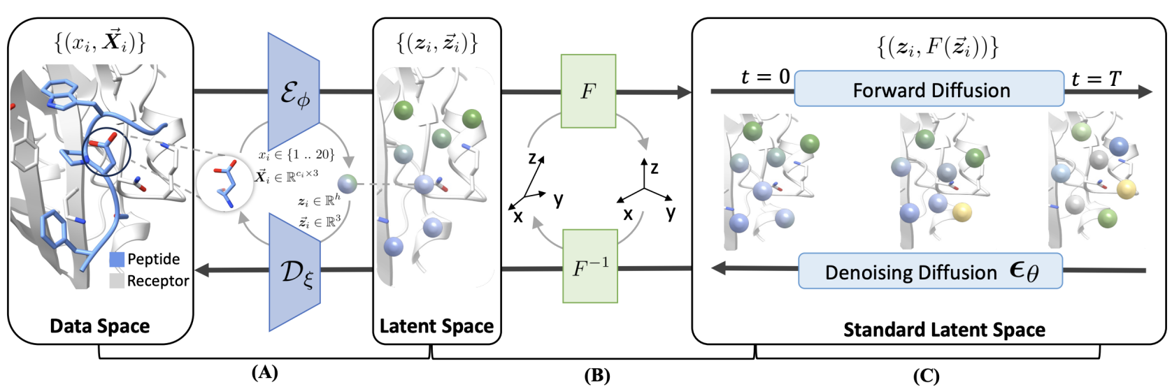 论文概述: 多肽设计在治疗学中具有关键作用,能够开辟利用以前无法药物化的靶点结合位点的全新可能性。在本文中,我们提出了一种用于全原子肽设计的几何潜在扩散生成模型(PepGLAD)。我们首先建立了一个由PDB和文献中的1D序列和3D结构组成的基准,用于系统评估现有生成模型的效果。利用现有扩散模型进行肽设计的两个主要挑战:全原子几何结构和结合位点多变的几何结构。为了解决第一个挑战,PepGLAD 设计了一个全原子变分自编码器,首先将可变大小的全原子残基编码为固定维度的隐空间表示,然后在隐空间中进行扩散过程后解码回数据空间。对于第二个问题,PepGLAD 探索了一种特定受体的仿射变换,将3D坐标转换到标准化的几何空间,从而提高了跨不同结合位点形态的泛化能力。实验结果表明,在序列结构共设计任务中,我们的方法不仅显著提高了多样性和结合亲和力(用rosetta衡量),还在结合构象生成上表现出色。