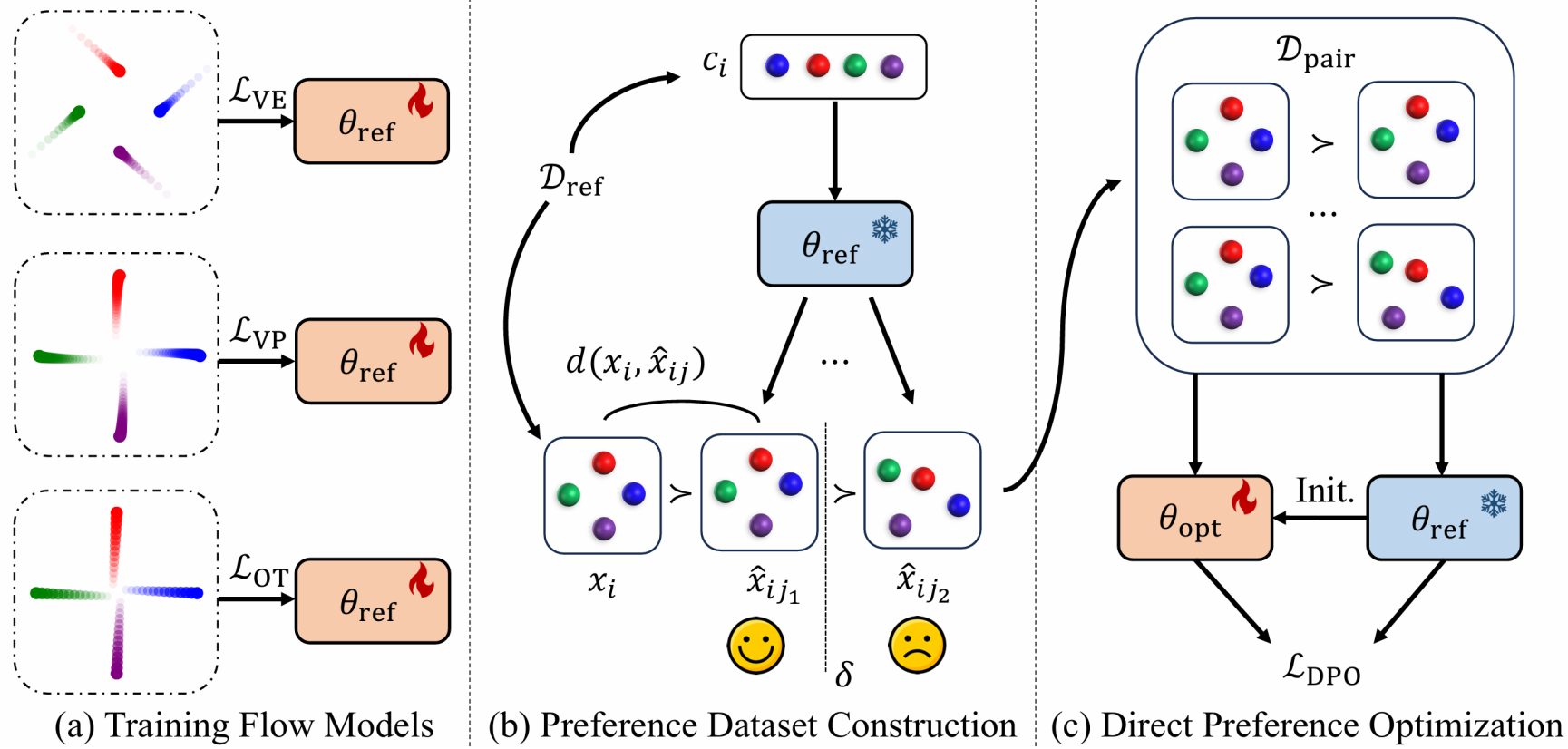论文概述:预测原子系统的三维结构是科学领域中的一个基础而具有挑战性的问题。近年来,生成模型在这一领域展现出一定优势,但此前的方法多聚焦于扩散模型,且采样过程中也常常生成非法结构。为了解决这些问题,我们提出了一种新的框架——FlowDPO,它通过流匹配模型(flow matching models)探索多种概率路径,并进一步利用直接偏好优化(Direct Preference Optimization, DPO)抑制结构生成过程中的不合法问题。我们的方法首先使用预训练的流匹配模型为每个训练样本生成多个候选结构。然后根据这些结构与真实结构的距离进行评估和排序,从而生成一个自动偏好数据集。基于该数据集,我们使用DPO对原始模型进行优化,从而提高其生成与目标参考分布高度一致的结构的能力。理论分析表明,该范式和目标函数能够与任意高斯路径兼容,展现出良好的普适性。在抗体和晶体的实验结果中,我们的FlowDPO展示了良好的效果,表明其在利用生成模型预测三维结构领域的巨大潜力。