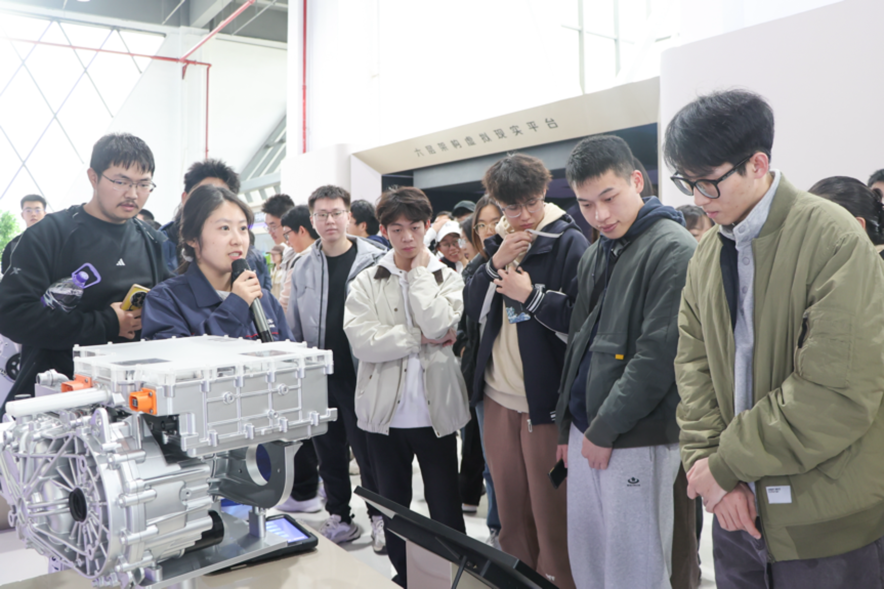 在展厅内,同学们观察了长安生产的国内第一辆军用吉普车“长江牌”46型吉普车,该车曾参加国庆十周年阅兵并装备部队。工作人员重点介绍了长安汽车近年来在新能源、智能化领域的最新成果,“大三电”、视觉感知、多模融合、中央+区域环网架构开发等核心技术。同学们也亲身体验了各种汽车产品,感受“新汽车+新生态”的科技创新魅力。同学们还乘坐观光车,进入生产车间,了解汽车生产流程以及自动化的制造过程。