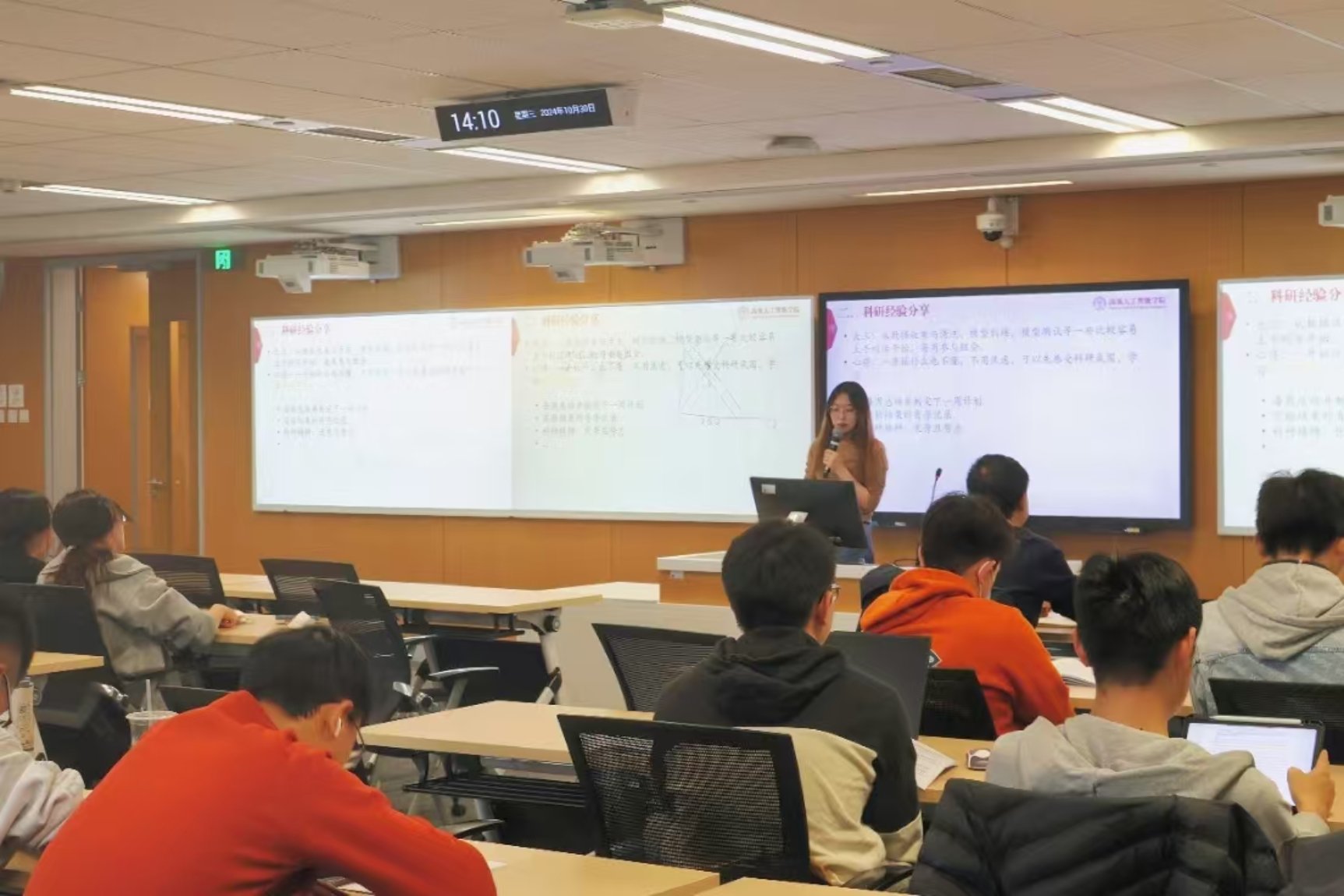 2021级本科生程翔同学介绍了自己在参与科研项目、发表论文方面的切身体验,并指出科研训练不仅有助于提升个人的学术素养,对未来求学及求职也大有裨益。同时,科研活动有助于同学们提前熟悉科研氛围,培养阅读和撰写论文的技能。此外,参与组会和学术报告,还能与师兄师姐及导师深入交流,获得宝贵的科研经验。他强调,科研项目最需要的是大胆尝试,同时需要时间和耐心。他鼓励同学们尽早适应科研氛围,培养文献阅读、论文撰写等基本技能,增强科研自信,并建议大家勇敢尝试,耐心投入。