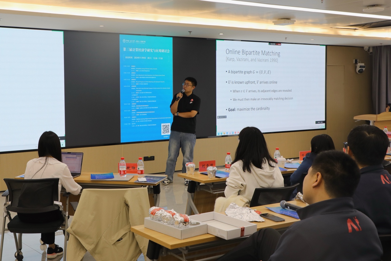 华中科技大学张乾坤副研究员介绍了在线匹配问题中随机奖励模型的研究进展。在线匹配问题是在线算法研究领域的核心问题,在现实生活中具有广泛应用场景。在线匹配问题主要关注二分图中的单侧在线模式,即一部分顶点是离线的(已知的),而另一部分顶点是在线的(逐步到达的)。“随机奖励”模型是一种将边与成功概率相关联的泛化模型,每个匹配的边都有一个与之关联的成功概率。在报告中,报告人介绍了在随机奖励模型上的一系列突破和研究进展。