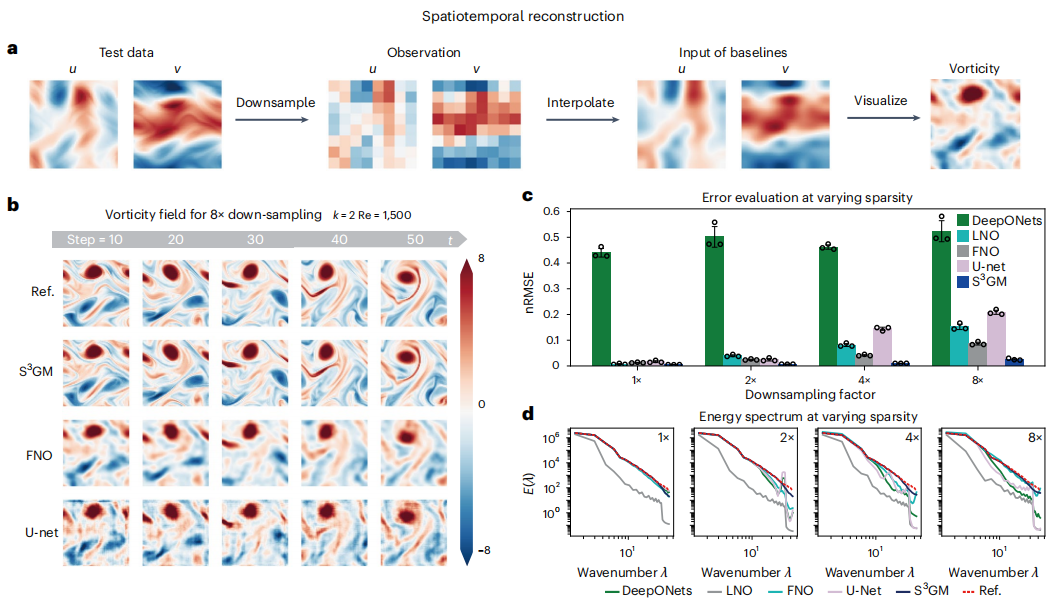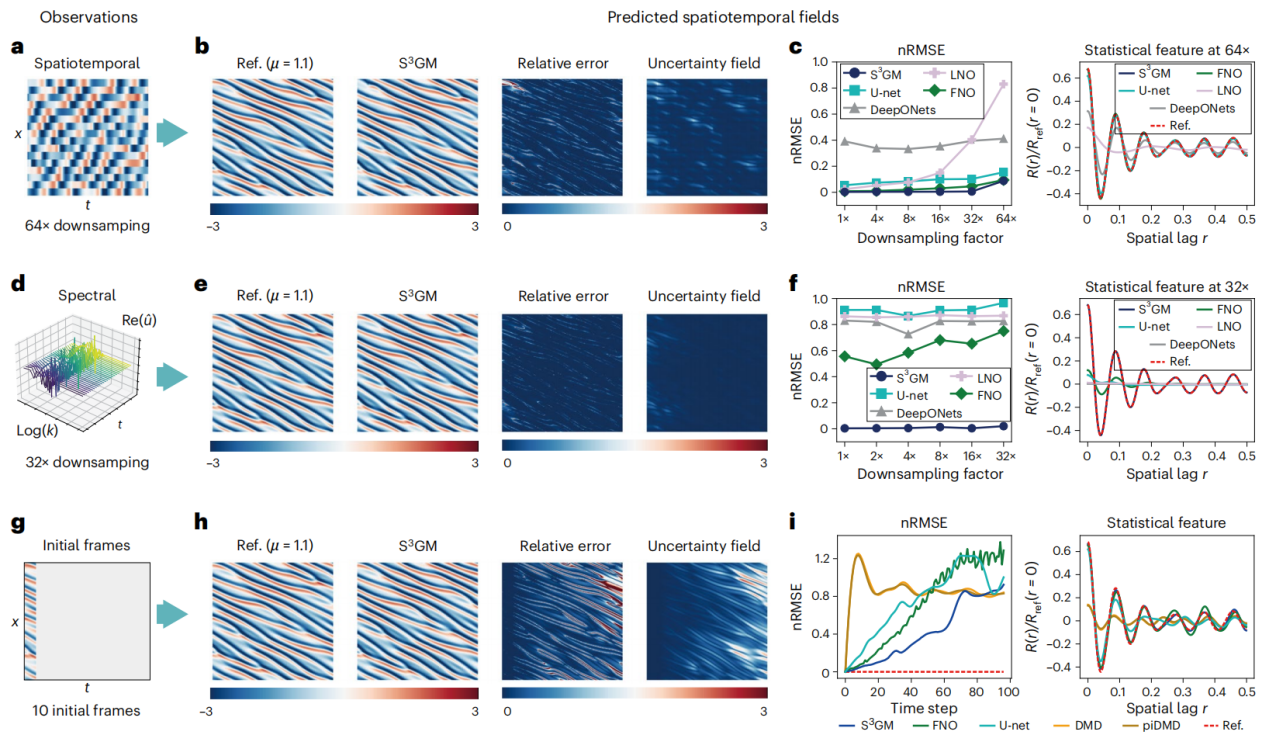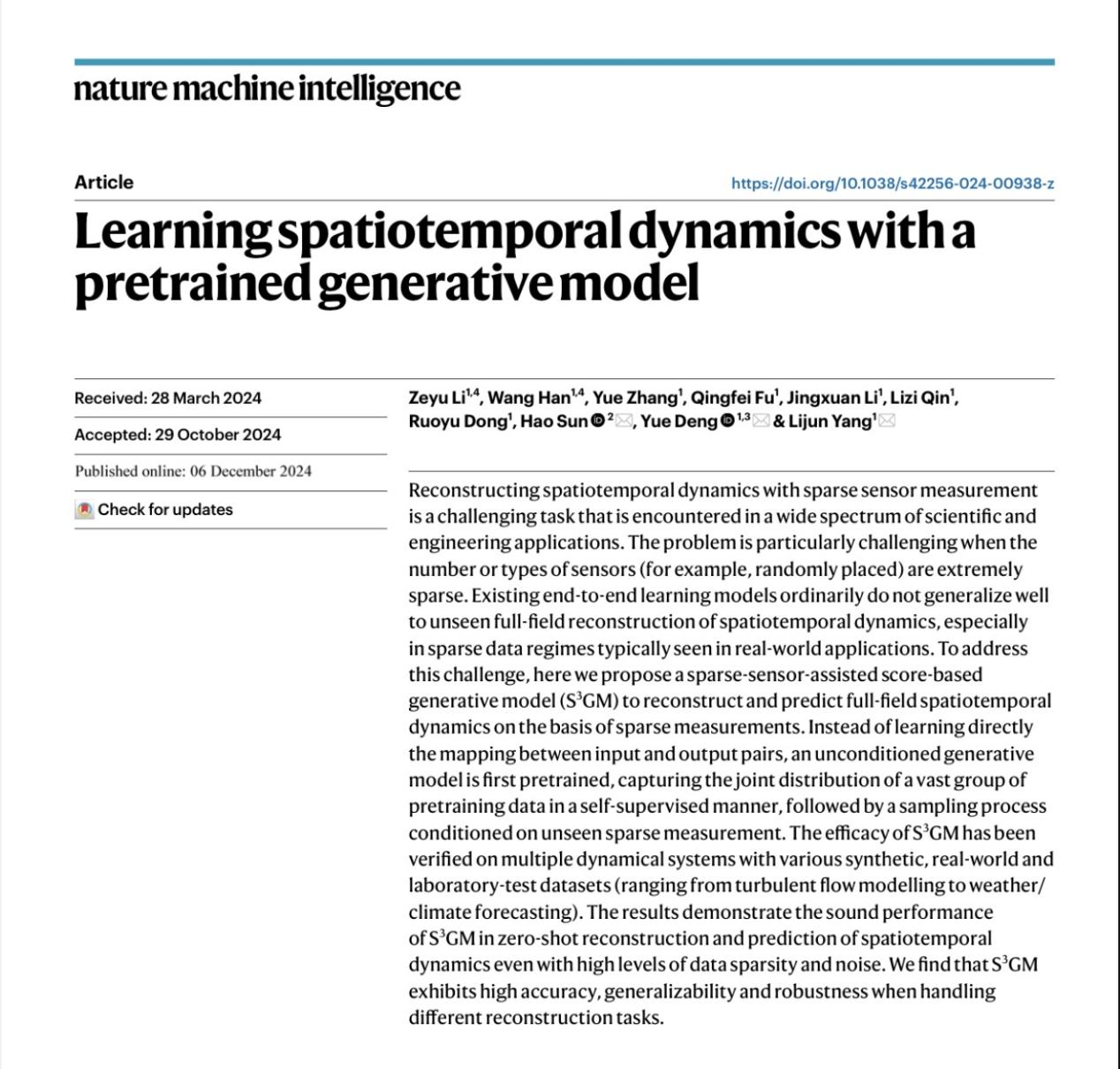 18JAV 长聘副教授孙浩团队与北京航空航天大学杨立军教授团队合作,在Nature子刊Nature Machine Intelligence(《自然-机器智能》)发表题为“Learning spatiotemporal dynamics with a pretrained generative model”的Article文章,提出了一种基于扩散生成模型的动态系统预测算法,称为 S3GM(Sparse-Sensor-assisted Score-based Generative Model)。该方法融合了物理先验知识与实验测量数据,旨在解决现代科学与工程中的一大关键挑战:从稀疏的传感器测量数据中重建复杂的时空物理场。研究团队展示了 S3GM 即使在数据极为不完整和有噪声的情况下,也能够准确预测燃烧、流动、气候演变及其他众多物理系统的动态过程,为动力系统建模提供了新的思路。文章共同第一作者为李泽宇(北航)、韩旺(北航),共同通讯作者为孙浩(人大)、邓岳(北航)、杨立军(北航)。