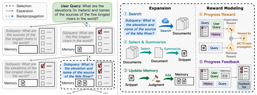 论文概述:在数字信息爆炸的时代,真实世界中的信息获取任务往往需要多步的网页搜索和复杂的信息整合,过程繁琐且容易出错。针对这一挑战,本研究基于全局引导的蒙特卡洛树搜索提出了一种全新的大语言模型驱动的搜索助手框架HG-MCTS。该方法将信息获取任务构建为一个逐步构建知识的过程,并引入记忆模块、自适应子目标清单和多视角奖励机制,全面提升复杂查询的覆盖性与准确性。其中,自适应清单用于动态生成子目标,引导搜索过程覆盖复杂查询的多个维度;多视角奖励机制则结合检索质量、探索深度及任务进展情况,为搜索路径提供反馈。该方法有效平衡了局部探索与全局引导,显著减少了冗余搜索路径,确保所有关键信息点均被准确覆盖。
