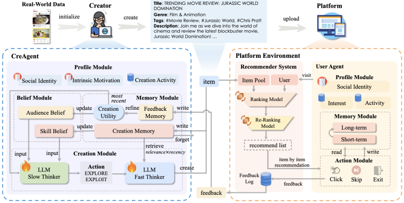 论文概述:维护推荐系统(RS)的长期可持续性至关重要。传统的推荐系统评估方法主要关注用户的即时反馈(例如点击),但往往忽视了由内容创作者引发的长期影响。在现实世界中,内容创作者可以通过分析用户反馈和偏好趋势,策略性地创作并上传新内容到平台。尽管已有研究尝试对创作者行为进行建模,但它们通常忽视了这些行为是在信息不对称的条件下发生的。这种不对称源于:创作者一般只能获取自己所创作内容的用户反馈,而平台则掌握完整的反馈数据。然而,现有的推荐系统模拟器通常没有考虑这一点,导致长期评估结果不准确。为了解决这一问题,我们提出了一种基于大型语言模型(LLM)的创作者模拟智能体 CreAgent。通过引入博弈论中的信念机制和“快-慢思维”框架,我们能够有效模拟信息不对称下的创作者行为。为了进一步提升 CreAgent 的模拟能力,我们采用近端策略优化算法(PPO)对其进行微调。我们的可信度验证实验表明,该模拟环境能够较好地复现现实平台与创作者的行为,从而提升推荐系统长期评估的可靠性。此外,借助这一模拟器,我们还能进一步研究诸如公平性、多样性等算法是否有助于提升不同利益相关者的长期表现。