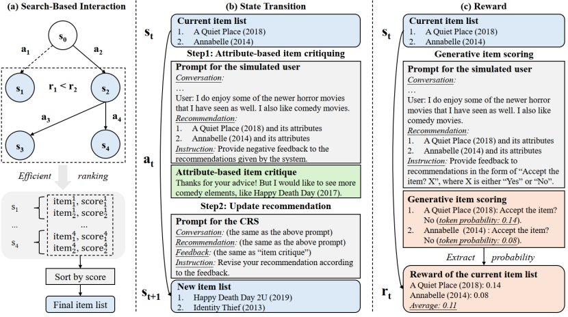 论文概述:对话式推荐系统借助多轮交互捕捉用户偏好并提供个性化推荐,其关键挑战是从对话中有效理解用户偏好。过往研究针对对话上下文信息不足问题,引入知识图谱、大语言模型等外部知识源,设计对齐策略用于理解偏好和推荐。但用户偏好复杂,即便有丰富外部知识,精准推荐仍具挑战,且频繁用户参与会降低体验。为解决该问题,我们提出基于生成式奖励模型的模拟用户,用于与系统自动交互。模拟用户对推荐商品反馈,助其捕捉复杂偏好。受生成式奖励模型启发,设计生成式商品评分(粗粒度反馈)和基于属性的商品评价(细粒度反馈)两种行为,并统一为指令格式,经指令微调构建模拟用户。为平衡效果与效率,借鉴奖励引导搜索范式,交互用集束搜索,还提出高效候选排名法优化推荐结果。大量公开数据集实验验证了该方法的有效性、高效性和可迁移性。