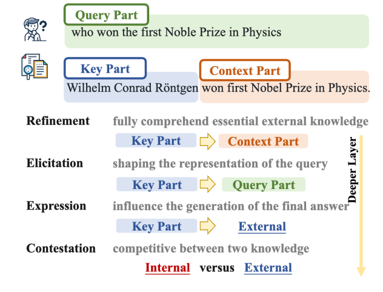 论文概述:本论文尝试对大型语言模型在检索增强生成场景中,融合参数化知识与检索到的知识的机制进行探索。在宏观层面通过知识流动分析,将知识利用过程划分为四个阶段:知识精炼、知识引出、知识表达和知识竞争,并观察到检索文档的相关性会影响知识流动。在模块层面,初步探讨了神经元激活、多头注意力机制和多层感知机在知识整合中的不同作用。