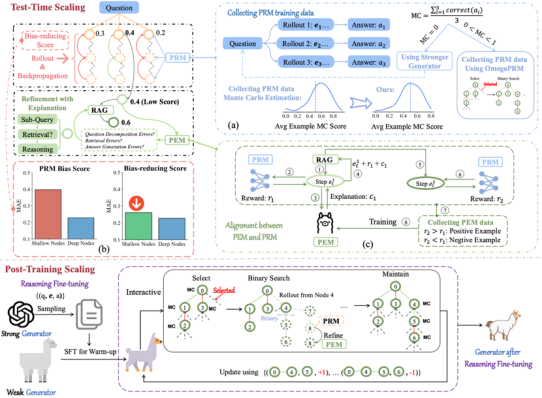 论文概述:基于检索增强生成(RAG)的大型语言模型(LLMs)在知识密集型任务中展现了潜力,但其推理能力,特别是在复杂的多步推理方面,仍然有限。尽管近期有研究探索将RAG与链式思维推理结合,或通过过程奖励模型(PRM)结合测试时搜索,但这些方法面临多个不可信的挑战,包括缺乏解释、PRM训练数据的偏差、PRM评分中的早期步骤偏差,以及忽视未能完全优化推理潜力的后期训练。为了解决这些问题,我们提出了通过可信过程奖励增强推理的框架(ReARTeR),该框架通过后期训练和测试时扩展增强RAG系统的推理能力。在测试时,ReARTeR引入了通过过程奖励模型进行的可信过程奖励,用于准确的标量评分,并通过过程解释模型(PEM)生成自然语言解释,实现步骤细化。在后期训练中,我们利用受可信过程奖励引导的蒙特卡罗树搜索收集高质量的步骤级偏好数据,并通过迭代偏好优化来优化模型。ReARTeR解决了三个关键问题:(1)PRM与PEM之间的不匹配,通过离策略偏好学习进行处理;(2)PRM训练数据中的偏差,通过平衡注释方法并为困难示例加入更强的注释进行缓解;(3)PRM中的早期步骤偏差,通过基于时间差的前瞻搜索策略加以解决。在多步推理基准上的实验结果表明,ReARTeR显著提高了推理性能,突显了其推进RAG系统推理能力的潜力。