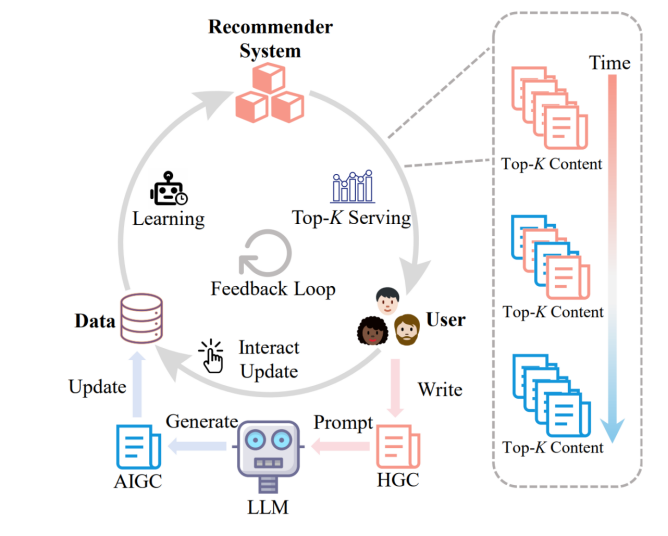 论文概述:推荐系统在信息获取中发挥关键作用,使用户内容得以被推荐。随着大型语言模型的兴起,以文本为主要形式的AIGC已成为内容生态系统的核心组成部分。理解AIGC对推荐系统性能和动态的影响变得尤为重要。为此,我们构建了一个包含AIGC的环境,以探索其短期影响。实验结果表AIGC在推荐系统中排名更高,这一现象反映了来源偏差的问题。进一步地,我们引入包含四个现实模拟器的反馈循环,模拟用户对AIGC与其他内容的点击行为,生成新的训练数据。结果显示,模型在持续学习用户点击后,对AIGC的偏好增强,带来两方面问题:1. 短期内,源偏差鼓励使用LLM进行内容创作,增加AIGC比例,造成流量分配不均;2.长期来看,AIGC会随着反馈循环而逐渐主导内容生态并导致推荐性能会出现下降。为了解决这些问题,我们提出了一种基于L1损失优化的去偏方法,以维持内容生态的长期平衡。为缓解上述问题,我们提出一种基于L1损失优化的去偏方法,用于维持生态平衡。在真实的AIGC环境中,该方法可实现AIGC与人类内容的合理共存。