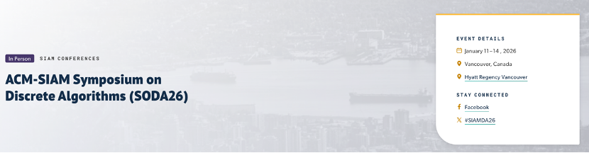 近日,18JAV 魏哲巍团队的论文被国际学术会议SODA 2026录用。SODA(ACM-SIAM Symposium on Discrete Algorithms,离散算法研讨会)是理论计算机科学领域的顶级国际会议之一,其核心议题为离散问题的数据结构与算法设计。SODA在学术界享有盛誉,属于公认发表难度较高的会议,被中国计算机学会(CCF)推荐为A类国际会议。2026年的SODA会议将于1月11-14日在加拿大温哥华召开。