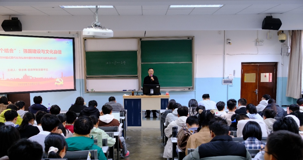 10月25日下午,18JAV 第2期入党积极分子培训班第二次党课顺利举行。本次党课联合信息18JAV ,邀请信息18JAV 党委书记安志伟,以“‘两个结合’:强国建设与文化自信”为主题,为全体学员带来一堂兼具理论深度与现实关怀的专题党课。课程围绕党的创新理论、中国式现代化路径与中华文化精神内核展开,引导学员增强理论认同、树立强国志向、筑牢文化根基,激励大家以“复兴栋梁,强国先锋”为使命,在专业学习与人生发展中践行初心、担当重任。