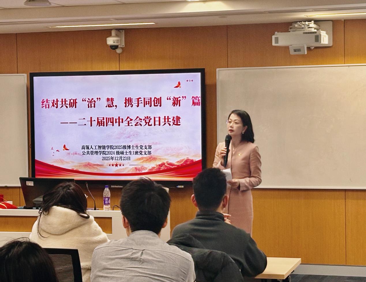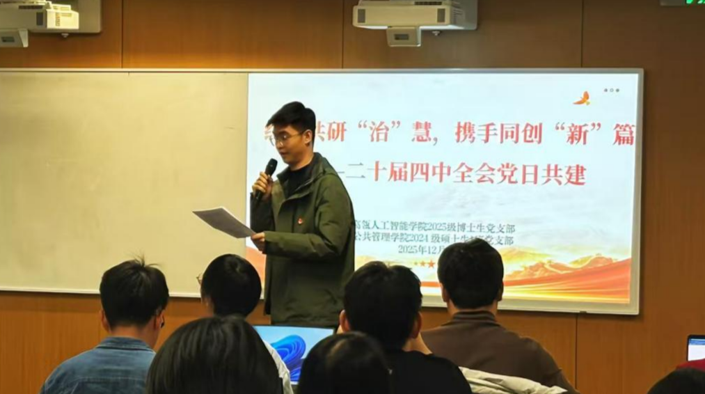 12月23日晚,由18JAV 2025级博士生党支部与公共管理学院2024级硕士生1班党支部共同主办的“结对共研‘治’慧,携手同创‘新’篇——党的二十届四中全会党日共建”活动在立德楼1002教室举办。18JAV 党委书记李艳丽、团委书记任安兴参加活动。本次活动由18JAV 2025级博士生党支部书记包增浩主持。两个支部的党员、入党积极分子齐聚一堂,通过跨越本硕博三个学段和跨学科的交流碰撞,深入学习贯彻党的二十届四中全会精神,共同探讨人工智能与国家治理现代化的深度融合。