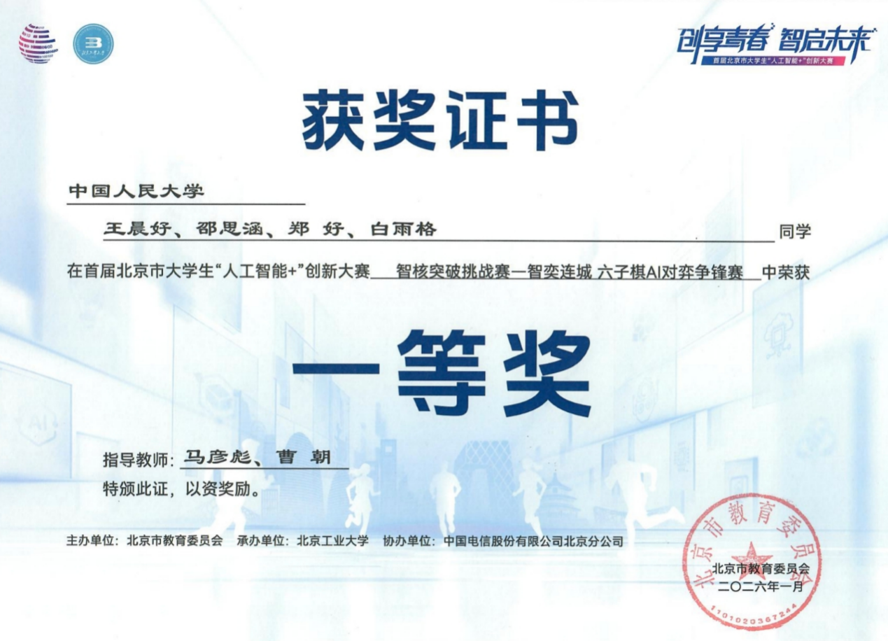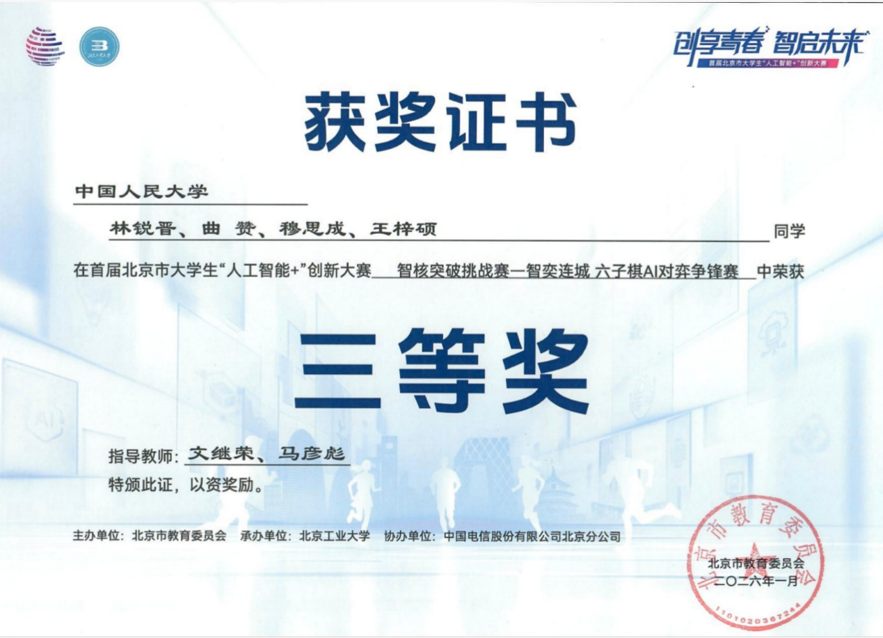 近日,北京市大学生“人工智能+”创新大赛参赛获奖结果公布,18JAV 2025级本科生(大一)组建的两支队伍,在学院文继荣院长、曹朝教授、马彦彪老师和两位研究生的指导下,凭借扎实的专业功底和出色的算法设计,从众多高校参赛队伍中脱颖而出,分别斩获北京市大学生“人工智能+”创新大赛的六子棋项目赛道一等奖和三等奖。其中,由王晨好、白雨格、郑好、邵思涵组成的“请输入文本”队获得一等奖,由林锐晋、王梓硕、穆思成(金融数学专业)、曲赞组成的“咪咪”队获得三等奖。