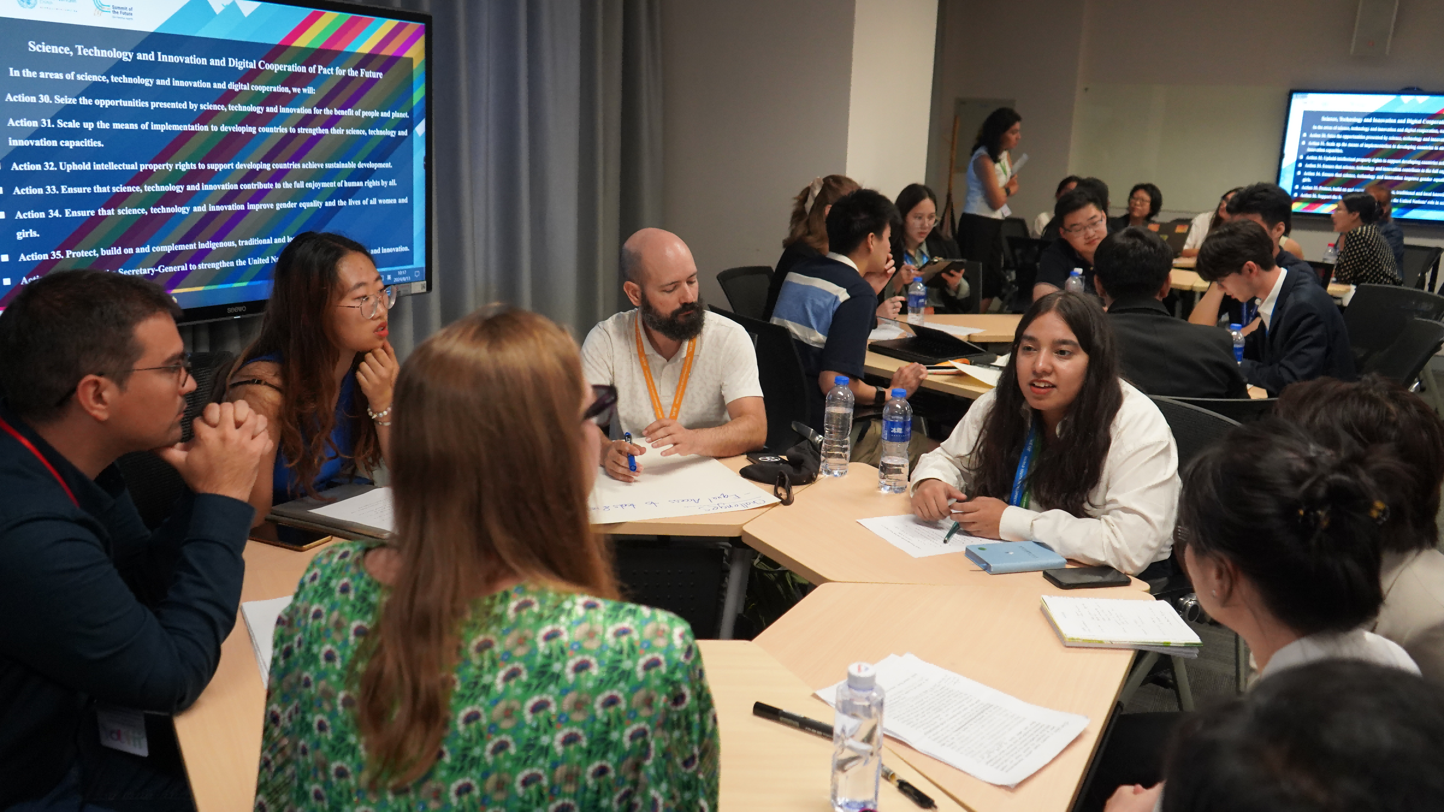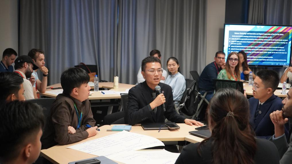 圆桌会设八个平行会场,平行会场由18JAV 青年教师和联合国驻华机构青年代表共同主持,专家学者进行引导性发言,各国青年代表围绕“可持续发展和发展筹资”“国际和平与安全”“科技创新与数字合作”“青年和子孙后代”“全球治理变革”5个议题进行了分组研讨。其中“科技创新与数字合作”议题由18JAV 长聘副教授严睿主持,2021级博士生李书琪、2022级本科生艾坤作为会议速记员参与青年圆桌会。