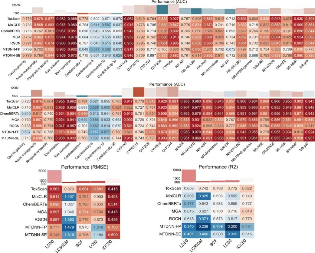 针对上述挑战,研究团队提出了一种融合多尺度信息的通用毒性预测框架ToxScan。该框架基于SE(3)等变神经网络,创新性地设计了双层表征学习范式:在分子水平编码宏观指纹特征,在原子水平深度融合二维拓扑与三维构象信息,并通过改进的SE(3)-Transformer 骨干网络在保持旋转和平移等变性的同时,精准捕捉原子间的空间相互作用及几何对称性。在此基础上,ToxScan进一步地引入了多任务学习范式,通过在涵盖众多毒性终点的大规模数据集上进行联合训练,学习跨任务的通用毒理特征,从而显著提升了模型对稀缺数据及复杂毒性终点的预测性能。