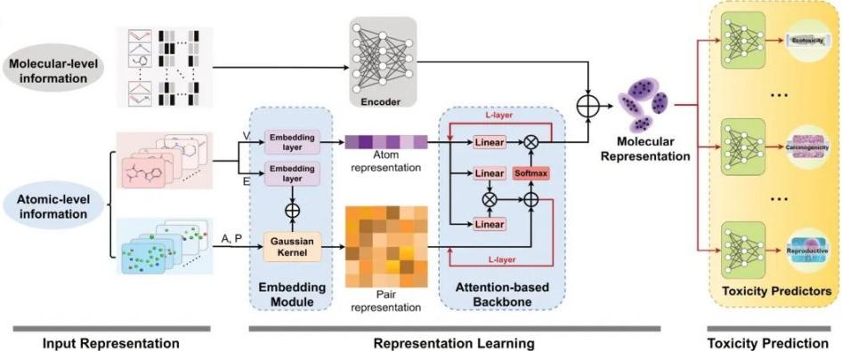 随着工业化进程的加速,全球化学品数量呈指数级增长,环境污染物的潜在毒性对人类健康和生态安全构成了严峻威胁。传统的毒性评估往往依赖于动物实验,不仅成本高昂、周期漫长,且存在伦理争议。虽然人工智能技术已初步应用于计算毒理学,但现有的毒性预测模型难以有效捕捉分子三维空间信息且在样本稀缺的毒性终点上泛化能力不足,严重限制了其在实际场景中的应用。