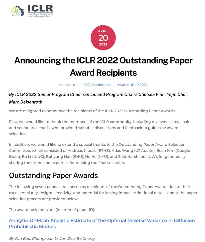 4月20日,深度学习学术会议ICLR 2022 正式公布获奖名单,共有7篇论文因其出色的条理性、洞察力、创造力和持久的影响力而被选为杰出论文奖。其中,18JAV 准聘助理教授李崇轩和清华大学张钹院士、朱军教授等人合作的论文《Analytic-DPM: an Analytic Estimate of the Optimal Reverse Variance in Diffusion Probabilistic Models》荣获该奖项。