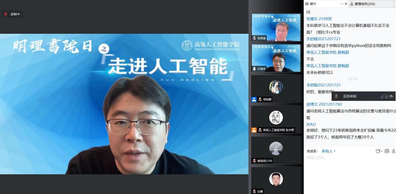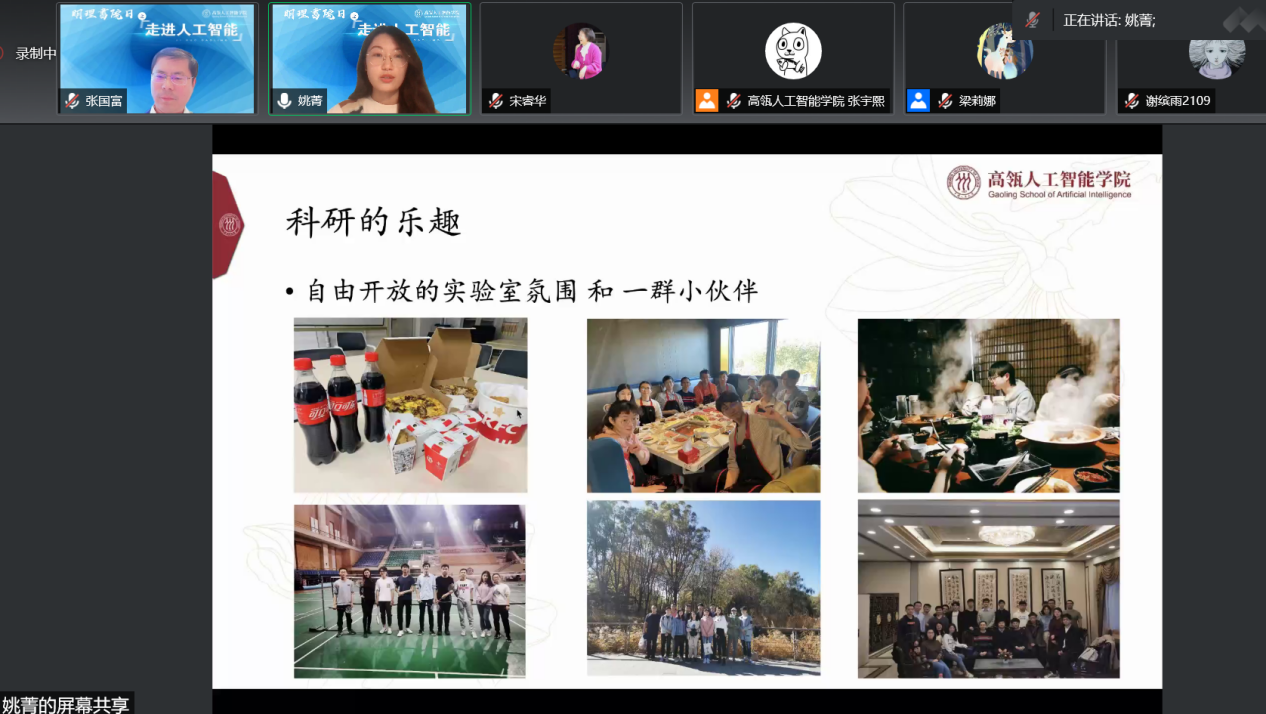 “学长说”环节,师兄师姐们分享了自己的学习科研经验。18JAV 2020级本科生陈路晰分享了自己学习人工智能的切身感受,鼓励师弟师妹们多与老师同学交流讨论,收获知识与快乐。窦志成教授指导的2019级硕士生、吴玉章奖学金获得者姚菁分享了自己与科研结缘的经历。她认为,在实验室培养的思考和解决问题的能力,以及快速学习新知识、理解新问题的能力,会让人受益终生。魏哲巍教授指导的2019级直博生、百度奖学金获得者王涵之,分享了人工智能研究的独特魅力,深度学习会让人体会到窥探事物本质的快乐,正是这种快乐引导在科研中不断进步成长。