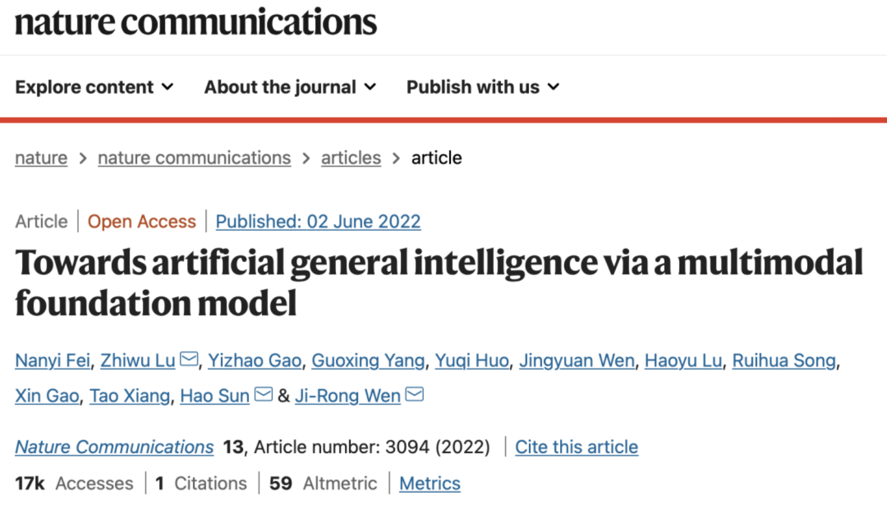 党的二十大报告指出,“创新是第一动力”。今年6月,由文继荣牵头的“文澜”团队论文“Towards Artificial General Intelligence via a Multimodal Foundation Model”登上Nature 子刊《自然·通讯》。团队成员通过“观察”人类大脑处理多模态信息的机制,提出文本与图片之间的弱语义相关假设,赋予了模型足够的想象能力和泛化能力,从而帮助人工智能应用快速有效应对各类认知任务。“(纯粹)多模态工作登上 Nature 子刊,在业界尚属首次,这是大模型项目力争世界领先的努力成果,也是多模态迈向通用人工智能这一研究方向的重要进展。”对于该工作的意义,18JAV 教授卢志武如此介绍。