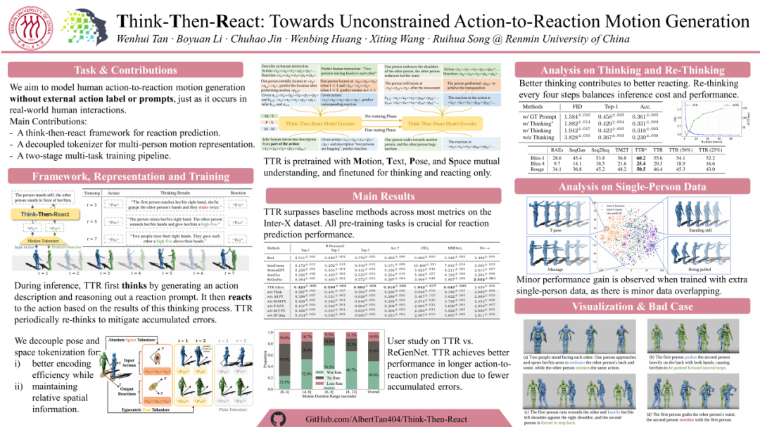 博士生谭文辉作为第一作者,代表团队在Embodied AI会场介绍论文“Think Then React: Towards Unconstrained Action-to-Reaction Motion Generation”。他颇有感触:“从进入机场开始,就看到周边都是背着poster的各路参会同学,为此感到格外兴奋。这份兴奋也一直保持到了会场中,大家昂扬着推广自己的论文(和自己本人),头脑在交流中不断迸出火花,照亮了许多思维的盲点。”