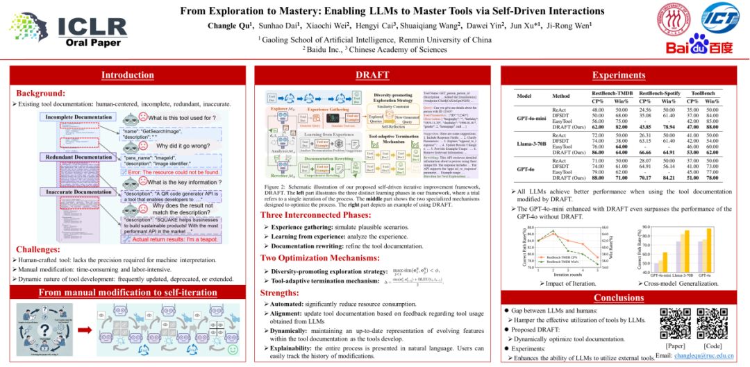 博士生渠常乐作为“From exploration to mastery: enabling LLMs to master tools via self-driven interactions” 论文的第一作者,进行了 Oral 汇报和 Poster 展示。他感慨道:“这是我第一次参加三大会这种大型的国际会议,与不同国家、地区和学校的同行交流,让我更好地理解了他们的研究成果和思路。这种面对面的互动加深了我对相关领域的认识,激发了我对未来研究的更多灵感和热情,也让我意识到了提高口语能力的重要性。