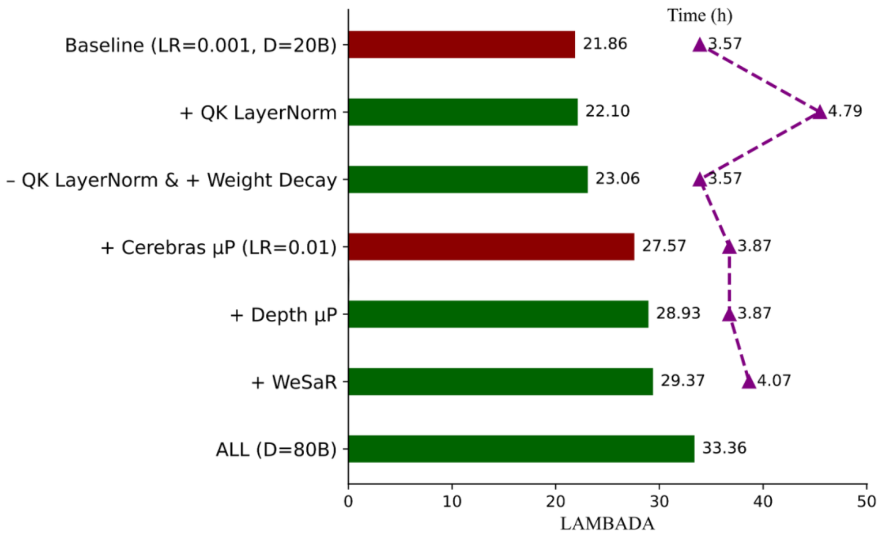 主要使用重参数化与 µP 初始化方法稳定训练,Z-Loss、Weight Decay等稳定技巧配合,在0.01大学习率下减少损失函数尖刺。