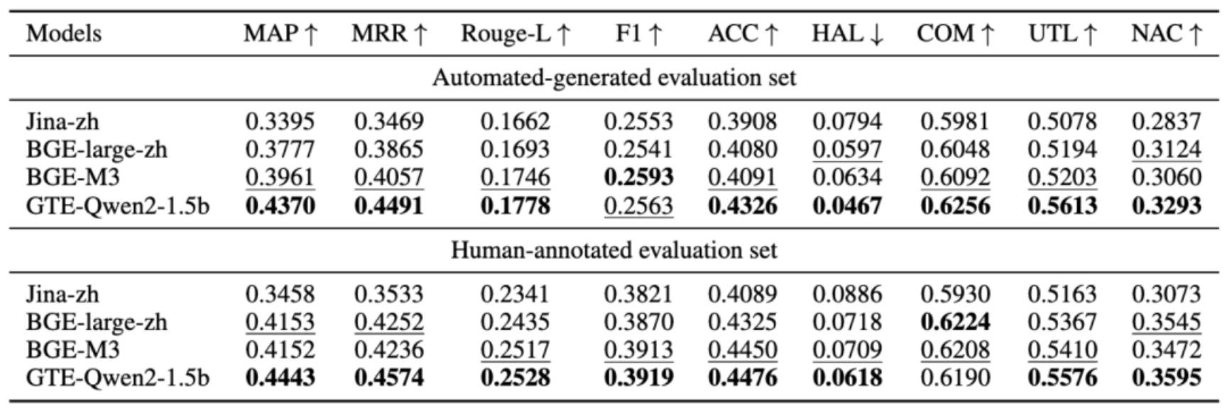 3. 幻觉(HAL):关注大语言模型生成的响应是否包含幻觉内容。如果答案完全正确或虽错误但源于检索文档,则幻觉值为0;若答案错误且内容不来自检索文档,则幻觉值为1,越低越好。