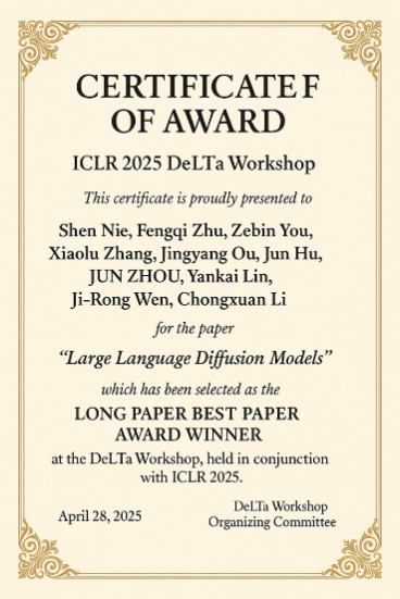 (图 3:LLaDA荣获重要国际会议ICLR研讨会最佳论文)