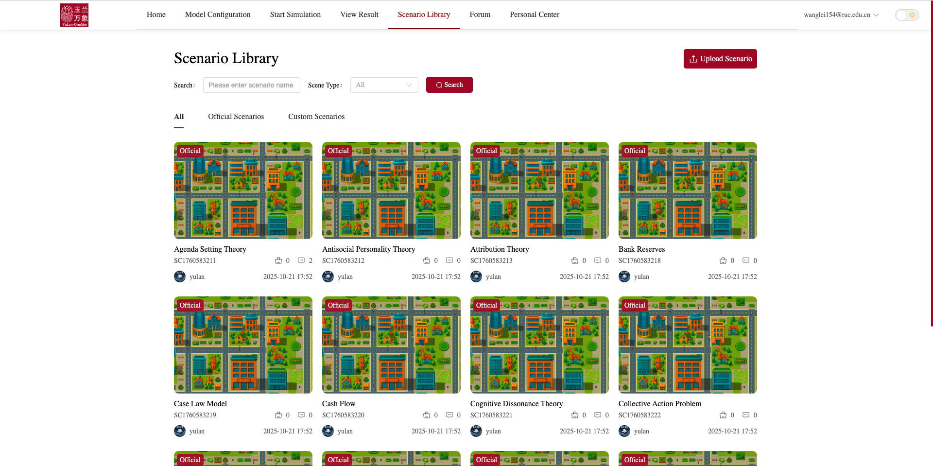 玉兰-万象在线版构建了一个开放、共享的社会模拟场景资源库,用户可在平台上浏览、分享和下载各类社会仿真模型与实验场景,覆盖经济运行、政治行为、法律制度、信息传播、心理互动等多领域研究方向。平台通过知识复用与场景共建,形成持续迭代、开放增长的社会模拟生态体系,让科研创新更加高效与可持续。