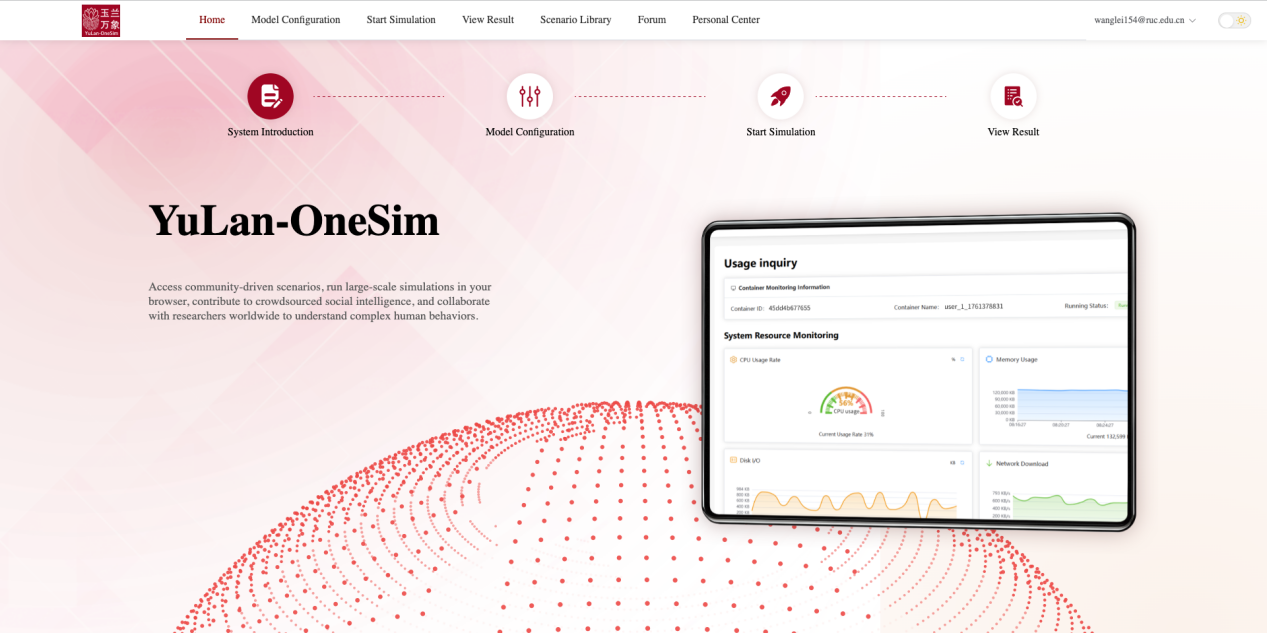为进一步完善平台功能、优化用户体验,玉兰-万象在线版(YuLan-OneSim Online)现正式开启首批测试用户招募。我们将率先开放一批测试版名额,面向科研院所、高校研究团队、政府与行业机构,以及对社会仿真研究感兴趣的开发者与学者开放申请。成为测试用户,您将优先体验平台的核心功能,包括社会模拟场景共享与下载、在线运行与可视化仿真、科研社区互动以及与离线版的无缝联动。同时,您还可对系统功能、性能表现与界面体验提出建议,与研发团队共同完善平台生态。